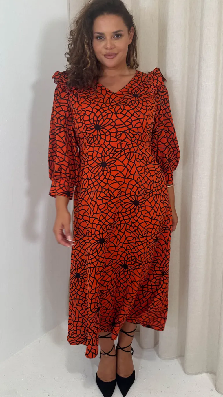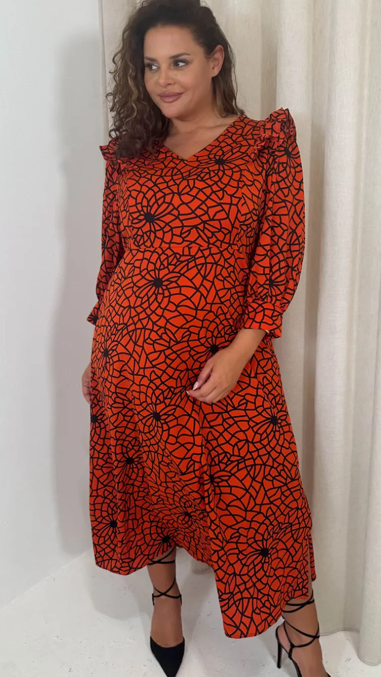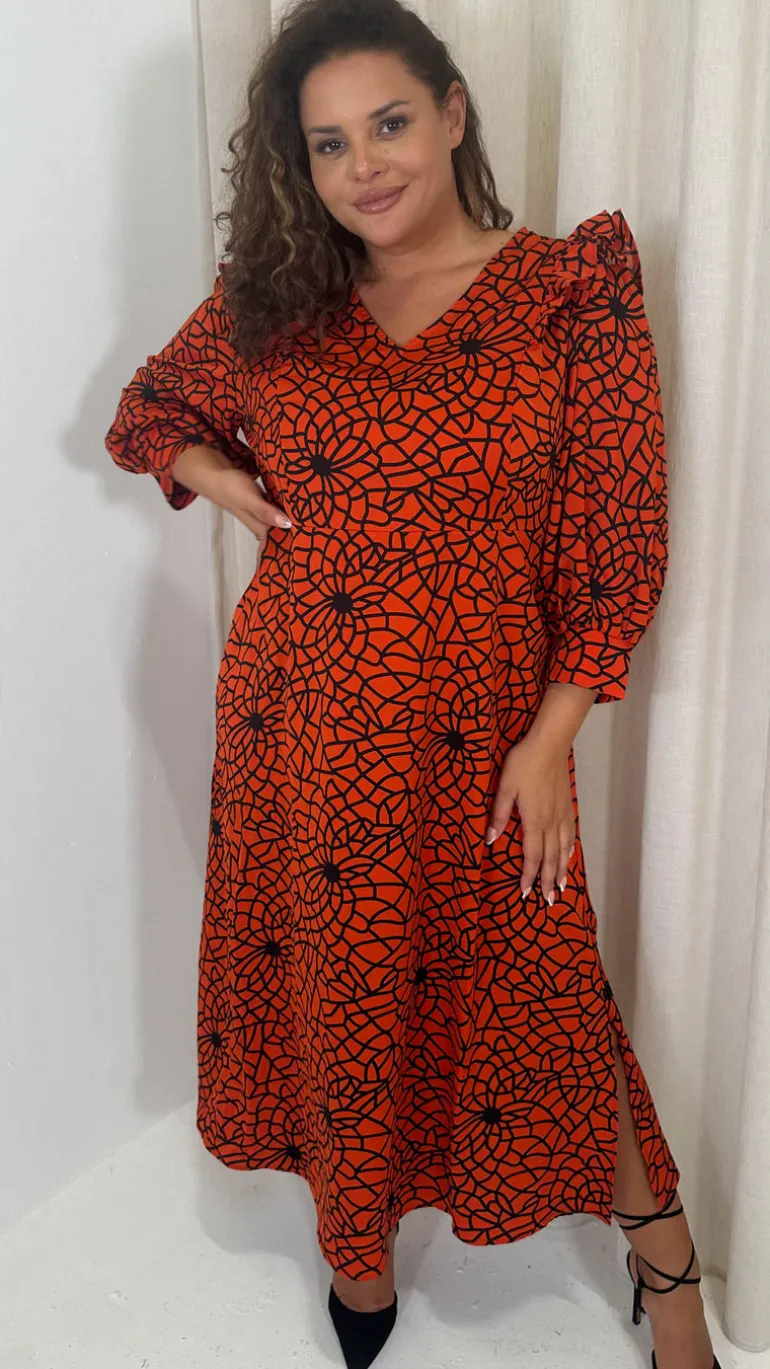 CurveWow Ruffle Shoulder V Neck Midi Dress Rust Grid