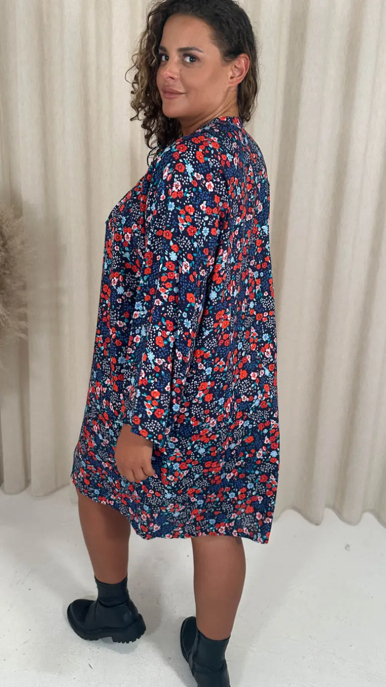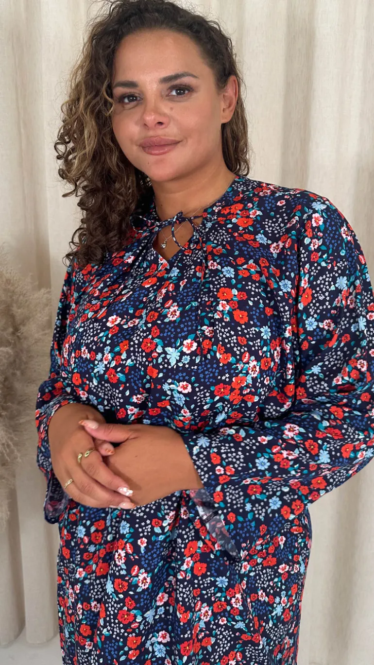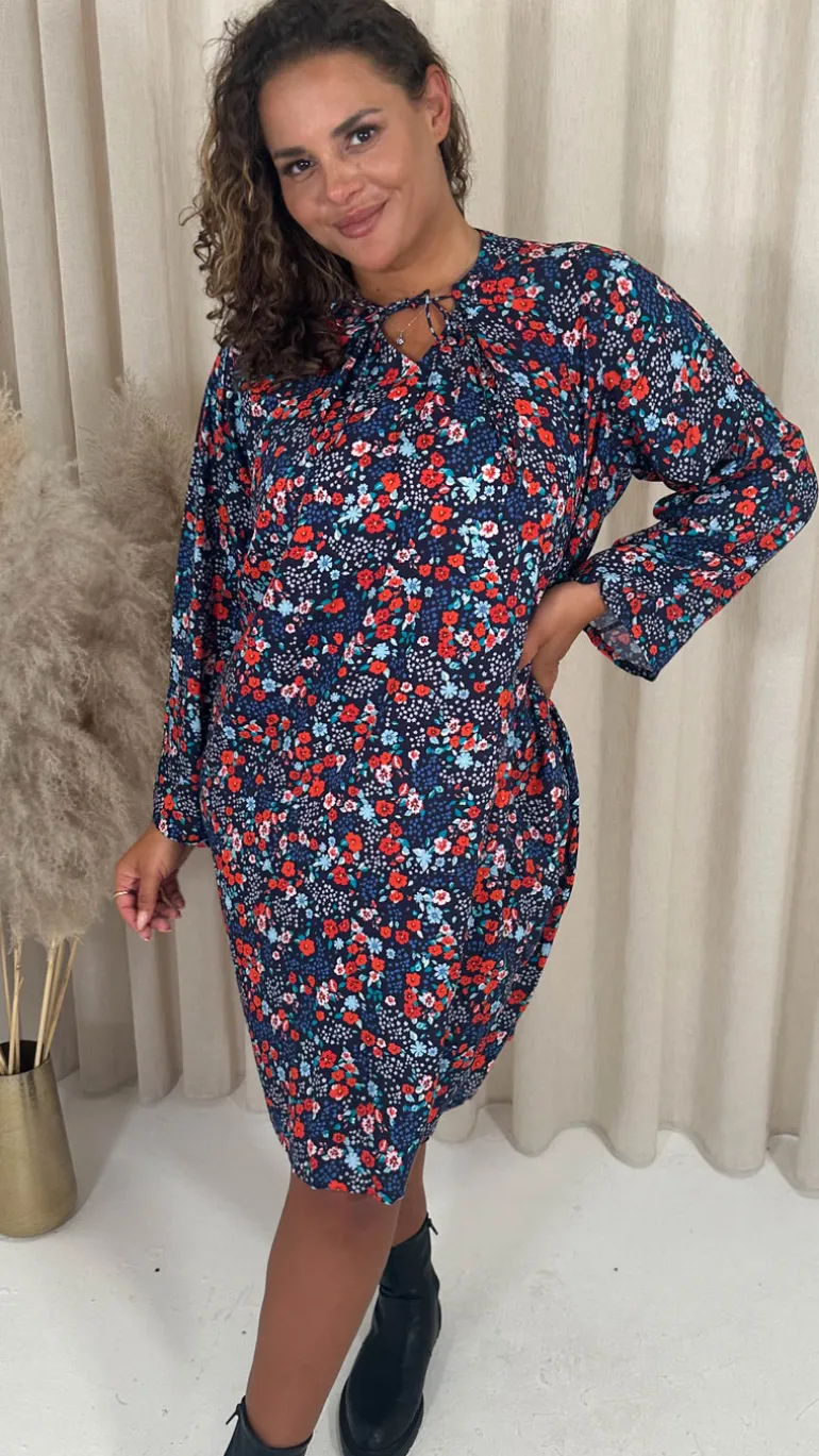 CurveWow Tie Neck Swing Dress Navy/Red Floral