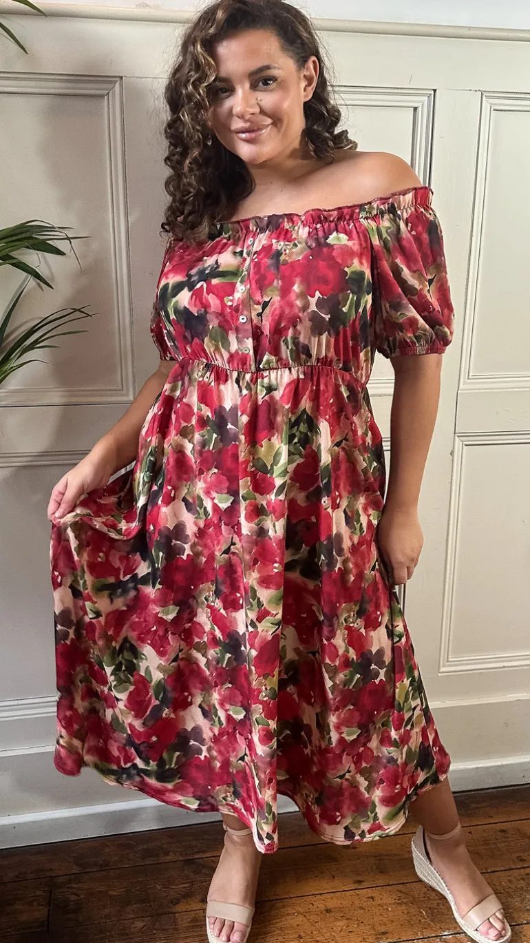 CurveWow Bardot Midi Dress Printed Blurred Floral