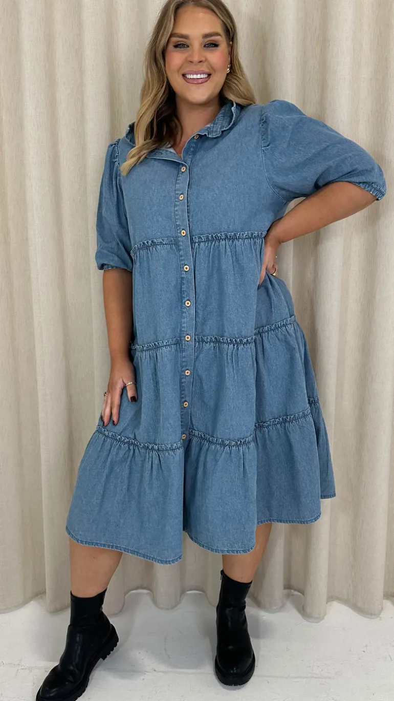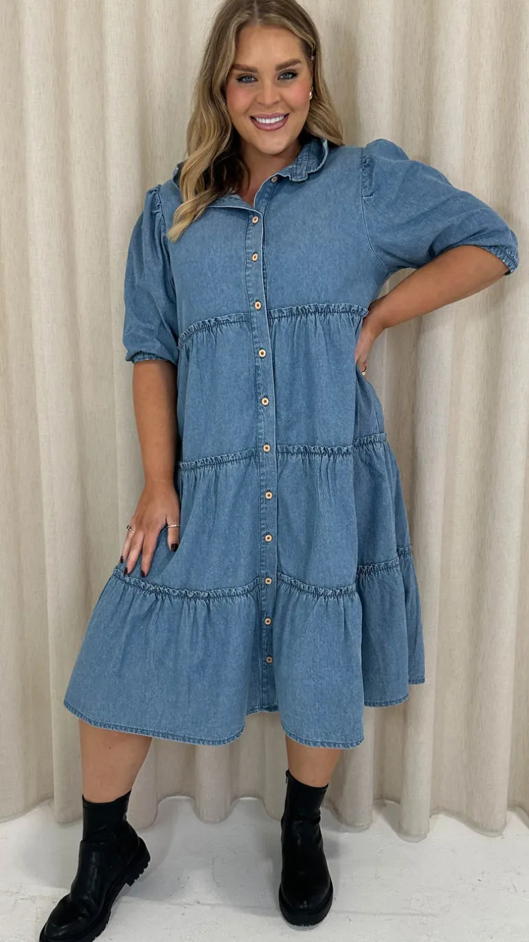 – Chambray tiered shirt dress