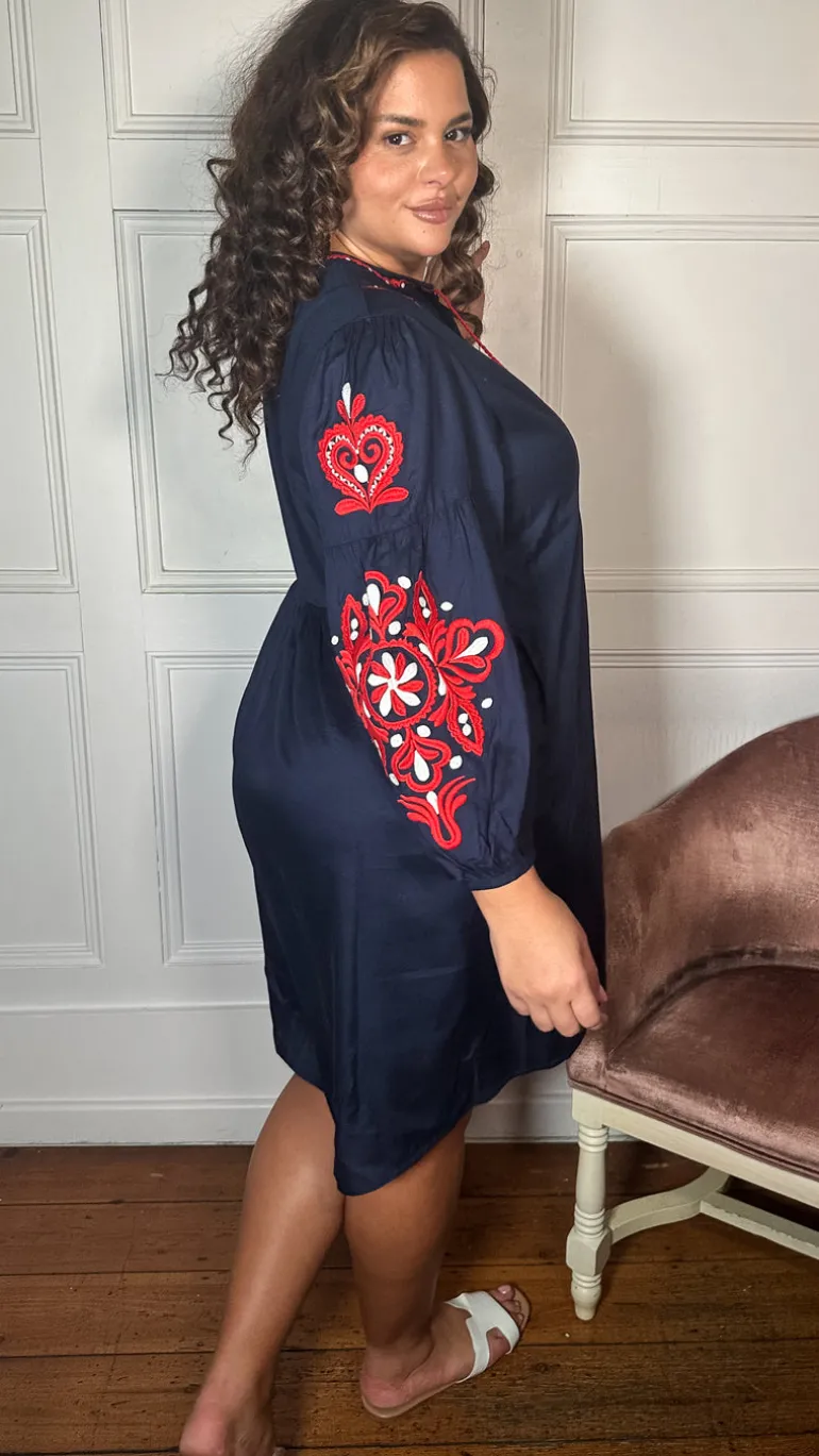 Curvewow Embroidered Tassel Tie Smock Dress Navy