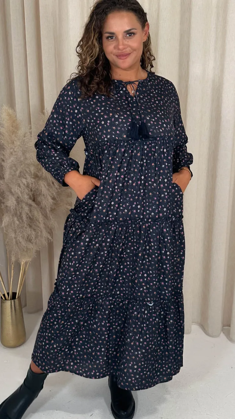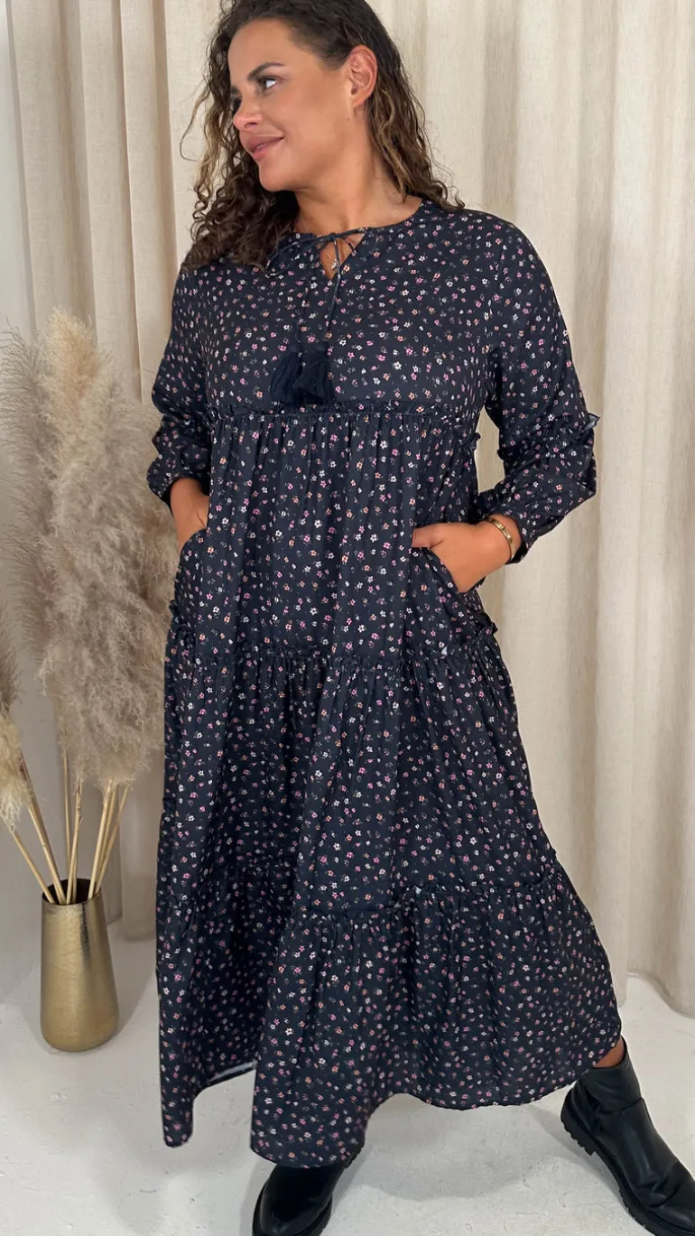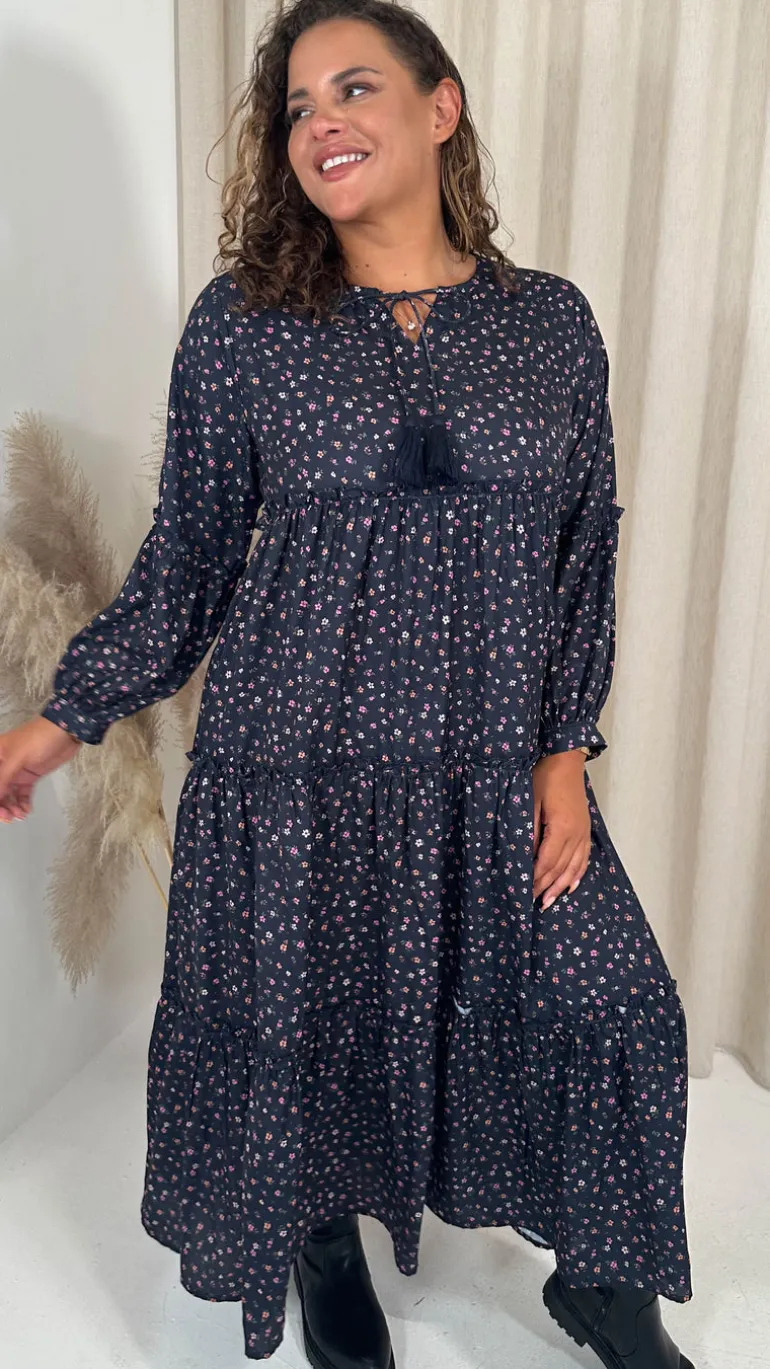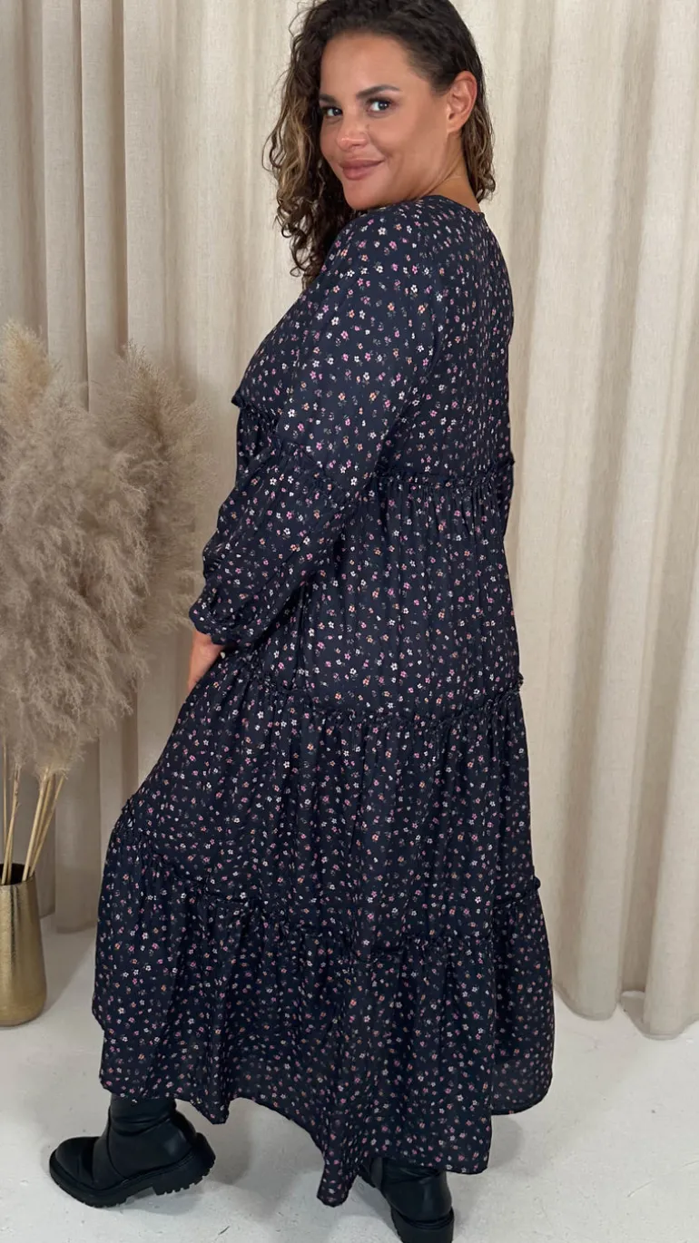 CurveWow Frill Tiered Maxi Dress Black Ditsy