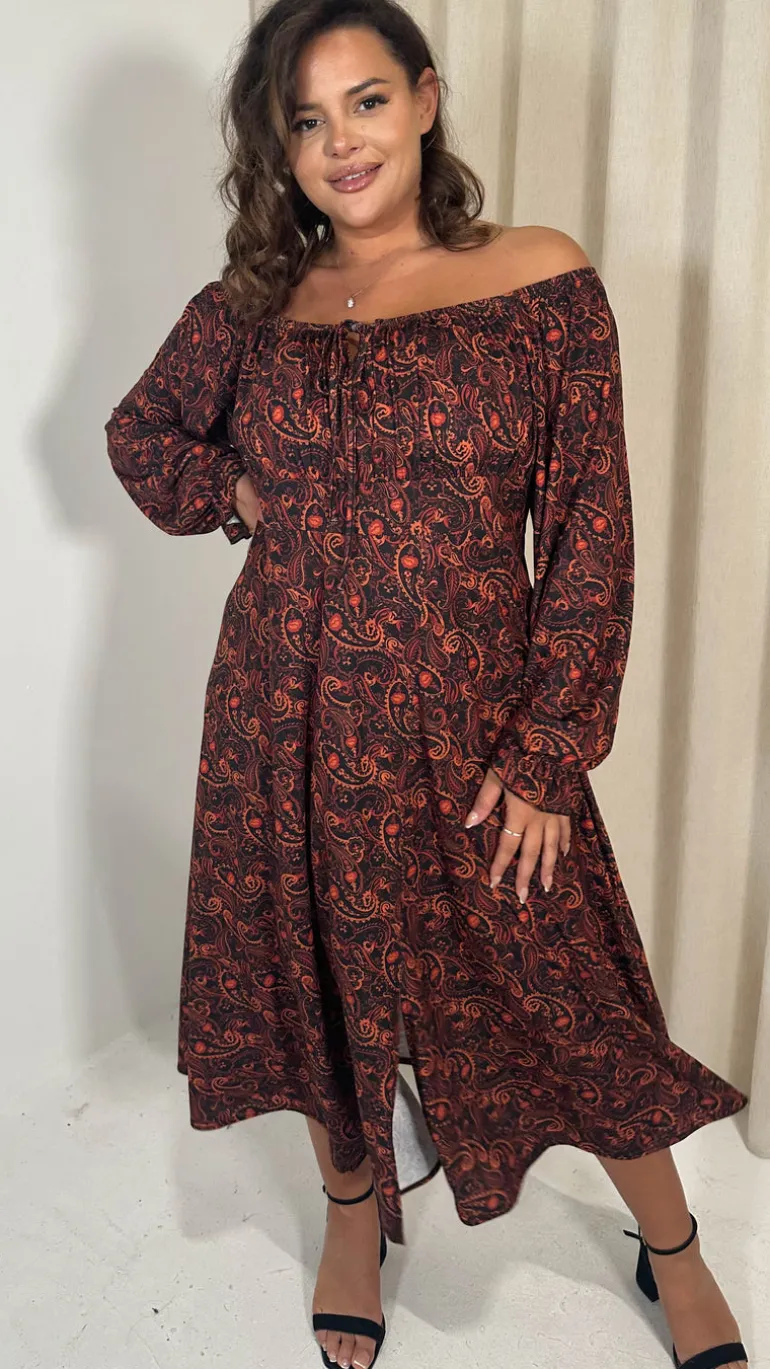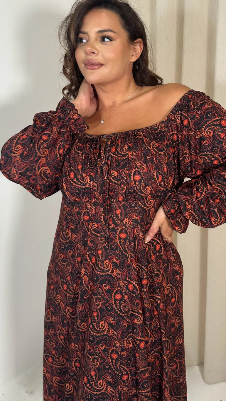 – Rust paisley print milkmaid dress
