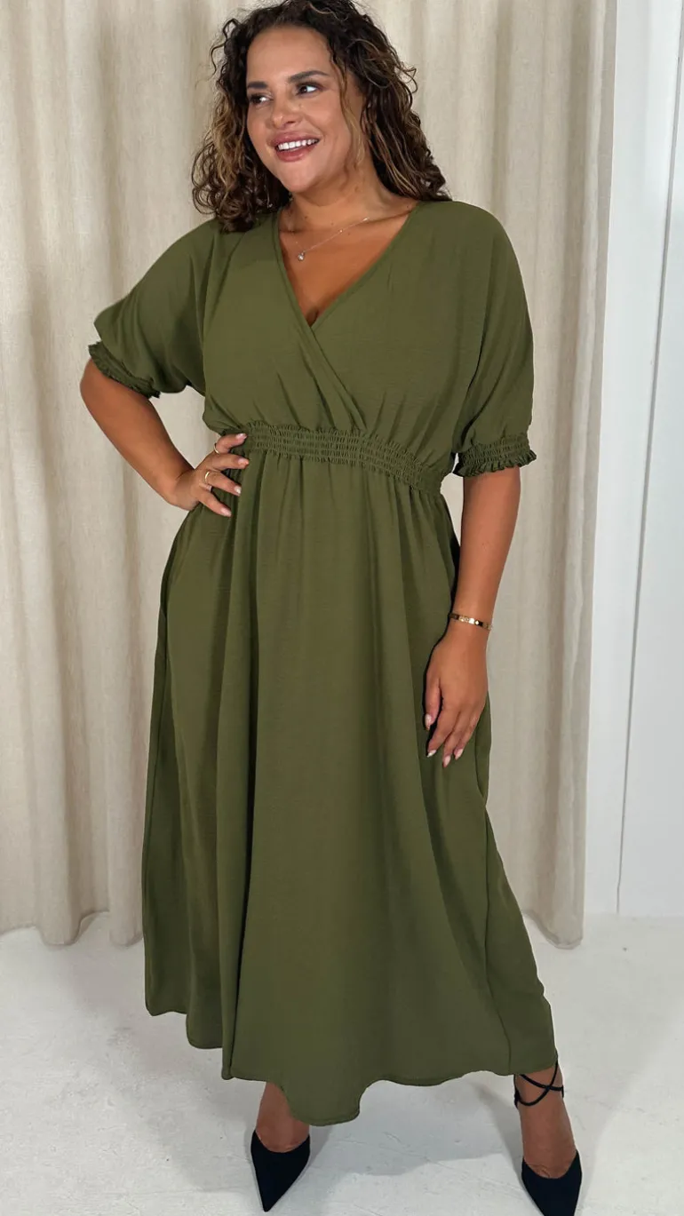 CurveWow Shirred Waist Cuff Midaxi Dress Khaki