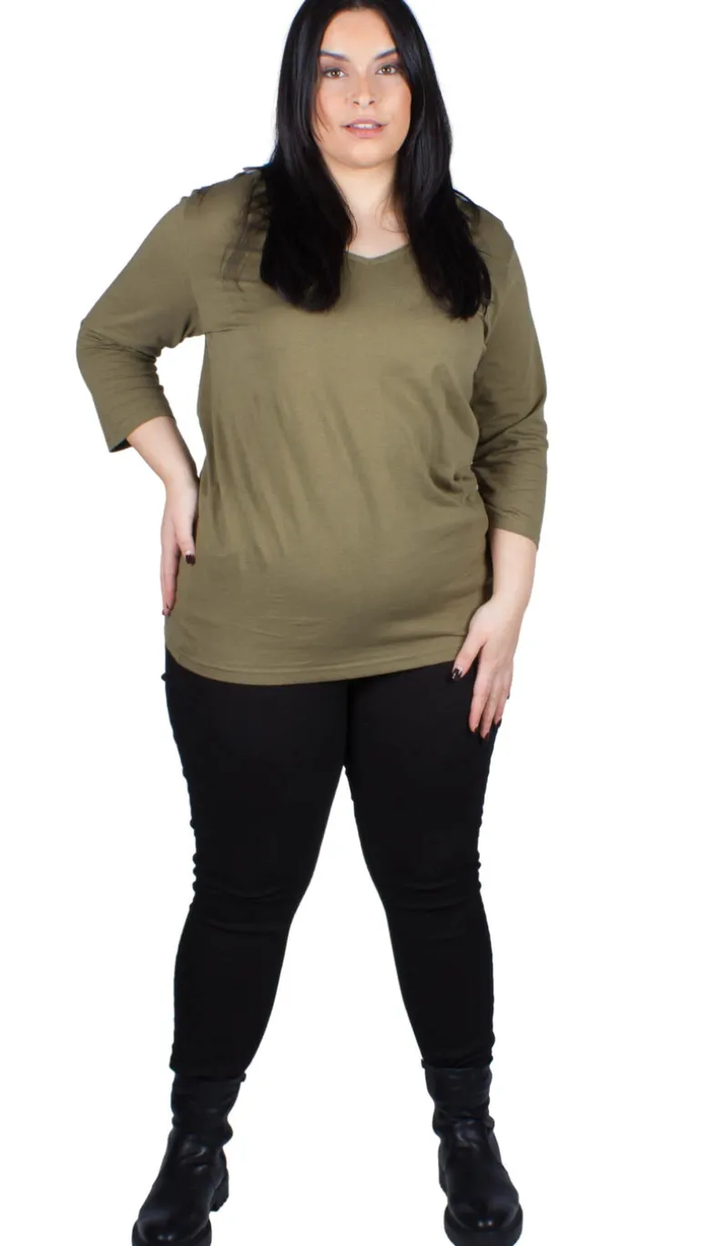This olive top is an essential basic and you need it in your wardrobe as its perfect to create an effortless everyday look. Made from a soft cotton fabric, it features a v-neckline and 3/4 length sleeves. Style with jeans, leggings and trousers for a casual day to day look.